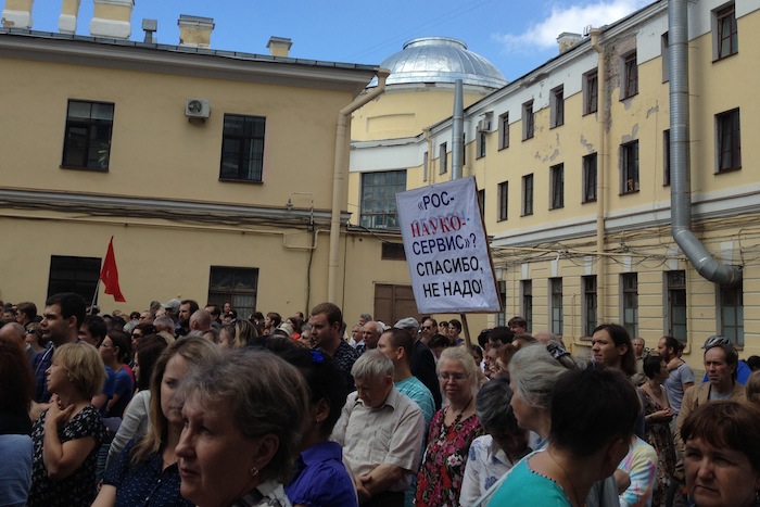 Во дворе Академии наук на Университетской набережной идет митинг партии КПРФ против реорганизации научного центра. Единственный лозунг — «„Роснаукосервис?“ Спасибо, не надо». На акцию вышли члены РАН и сторонники коммунистов, требующие отставки правительства и президента.