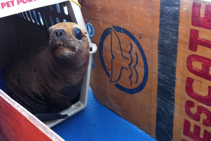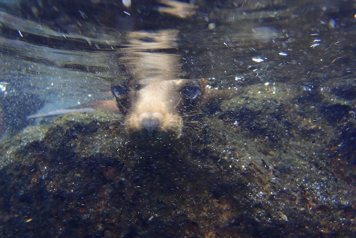 Когда мы приплыли к месту и камеры были наготове поймать картинку красивого прыжка, Хавьер замедлил и не очень торопился покидать команду. Его, видимо, укачало и он как-то очень робко выходил из клетки-перевозки и потом долго не понимал, почему столько народу пялится на него, а там, вдали, орут его соотечественники. Мы его немного даже подтолкнули к решающему прыжку, после чего он сразу поплыл к новым друзьям, и в первую же минуту получил ознакомительный поцелуй от другого котика в знак того, что его приняли в стаю.