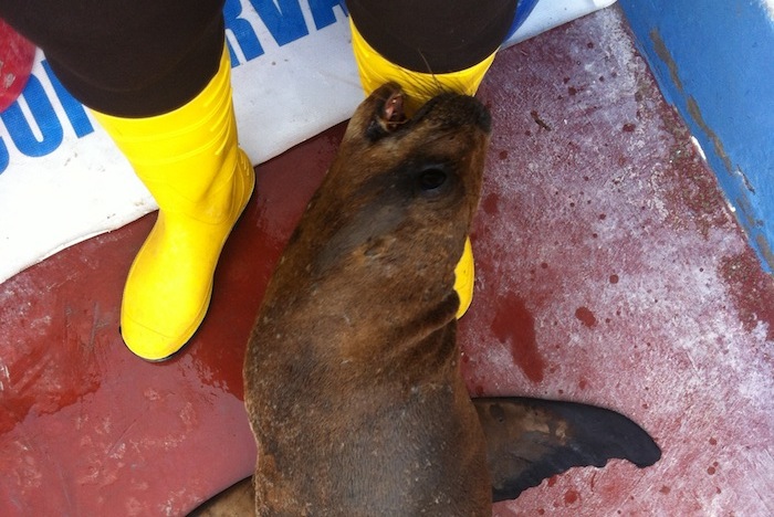 В день, как приехала, сразу познакомилась с новым другом, Хавьером, откормившимся 40-килограммовым морским котиком, который заканчивал срок своего пребывания в центре и был выпущен на свободу. Немного о персонаже: Хавьер, очень безумный котик, о чем я была предупреждена заранее. Похоже, рыбаки сильно ударили его по голове и он стал плохо видеть вдали, подслеповат стал, особенно на левую сторону. Когда требовалось что-то рассмотреть, ему нужно было подойти близко-близко, так, чтобы уткнуться носом в объект. Он быстро подбегал и резко утыкался носом в сапоги или коленки, потом, удовлетворенный, мог отойти.