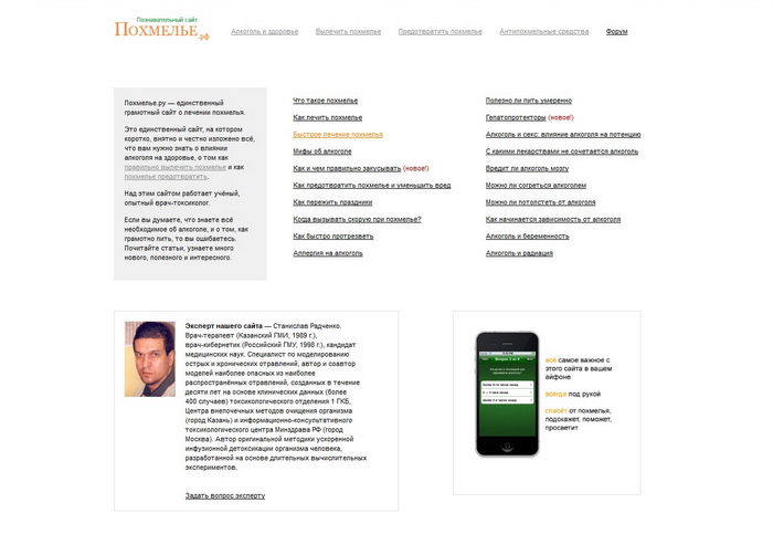 Сайт Похмелье.рф призван бороться с проблемой, которая знакома всем, вне зависимости от места жительства, но россиян она мучает особенно часто. У ресурса есть своё приложение для iPhone, включающее в себя весь самый важный контент сайта. С помощью этого карманного справочника можно подобрать себе индивидуальную программу по борьбе и даже по предотвращению похмелья. По словам авторов проекта, все рекомендации разрабатывались врачом-токсикологом. Пользователи, уже скачавшие эту программу, советуют готовиться заранее — не всегда легко следовать подсказкам, когда они нужны больше всего.