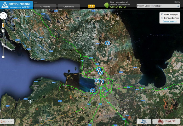 Так, например, Google совместно с Auto.ru представила проект «Дороги России», который позволяет проводить мониторинг качества дорожного покрытия. Каждый владелец телефона с операционной системой Android может поучаствовать в формировании карты. Для этого достаточно скачать приложение, которое будет «считывать» состояние подвески автомобиля и отправлять результаты на сервер. Общую карту можно исследовать как через приложение, так на сайте. Кроме автоматического мониторинга, ресурс позволяет пользователям размещать фотографии обнаруженных выбоин и трещин.