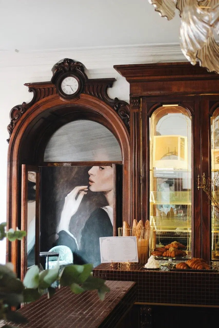 Создатели бистро сохранили остекление и другие исторические элементы интерьера: аптечные шкафы, плитку, лепнину на потолке. Помещение украсили росписью на стене, выполненной уличной художницей Ульяной Полоз, известной благодаря вписыванию фрагментов картин в городскую среду.