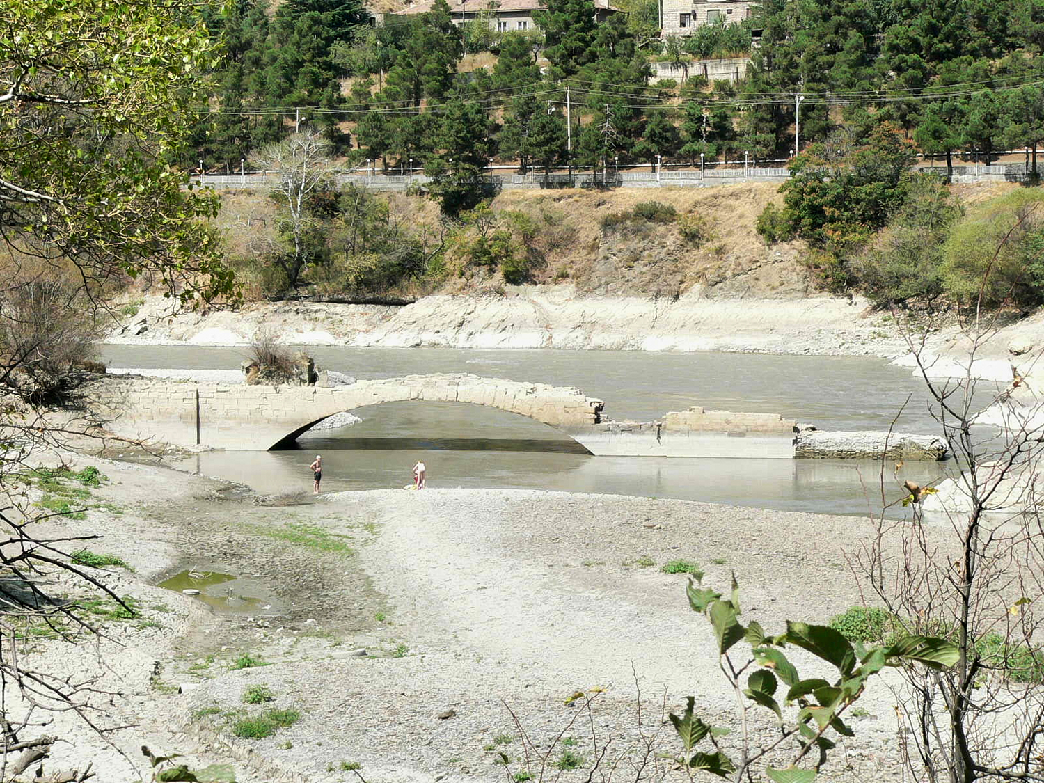 Было бы приятно, если бы полузатопленные руины им и оказались, но это, конечно, не так. Это — остатки более свежей переправы, сооруженной на месте оригинального моста Помпея в 1839–1841 годах русскими военными инженерами. Оценить ее былой масштаб и сложную форму можно на старом фото. Заодно можно понять, насколько сильно электростанция на Мтквари изменила весь рельеф долины. В 1926 году, когда была построена ГЭС, мост хотели заранее подорвать, но протест заявили защитники старины — вдруг здесь и правда уцелели хотя бы отдельные камни древнеримской кладки? Поэтому мост оставили самостоятельно разваливаться от влажности и времени.