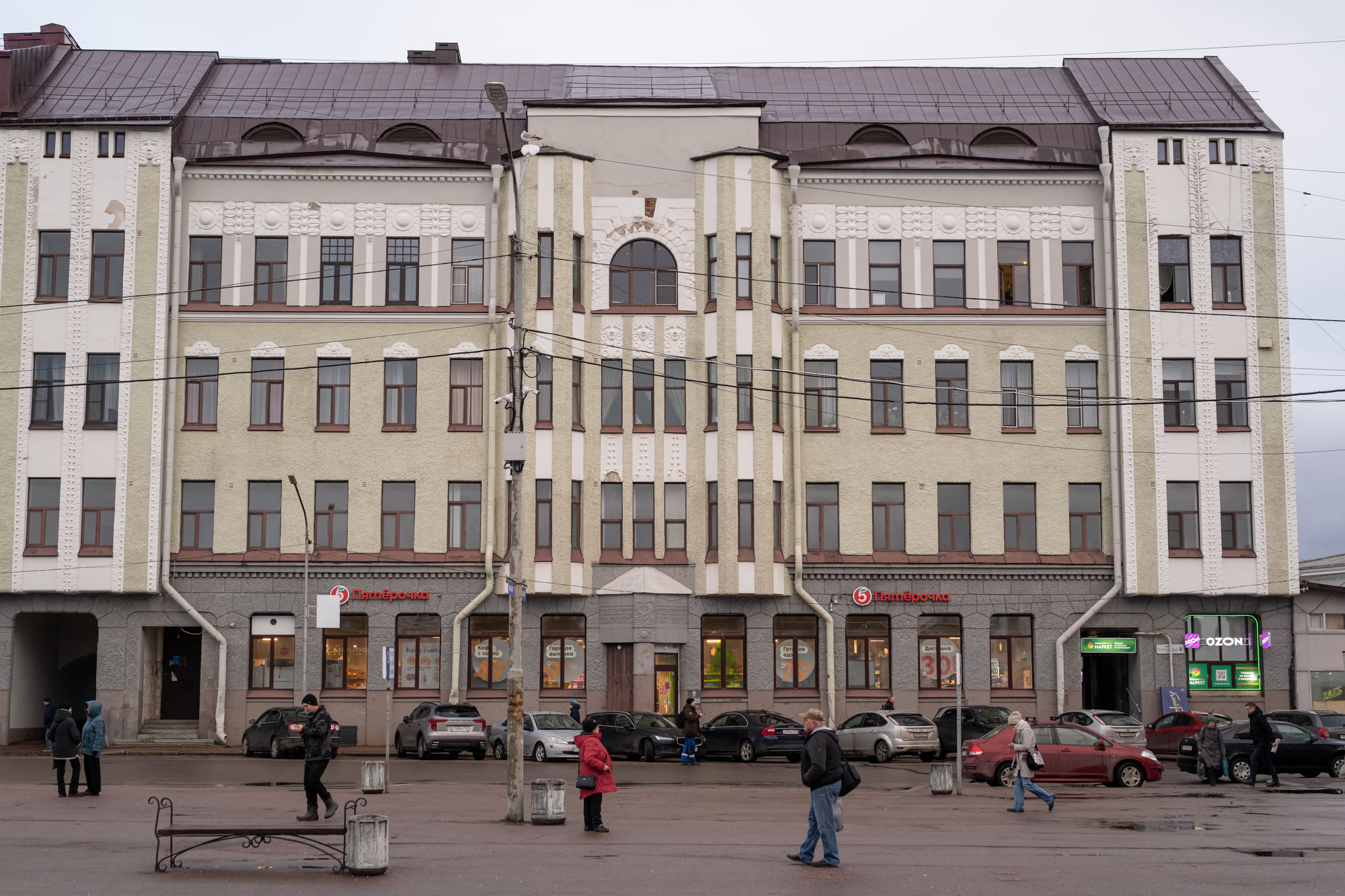 - Совсем рядом, на проспекте Ленина, 8а, обратите внимание на бывший дом Национального акционерного банка, сейчас внутри — квартиры. Чертежи здания составило бюро «Нюстрем-Петрелиус-Пенттиля», соорудили дом в 1901 году. Обратите внимание на герб Финляндии на фасаде и гранитный паровоз.