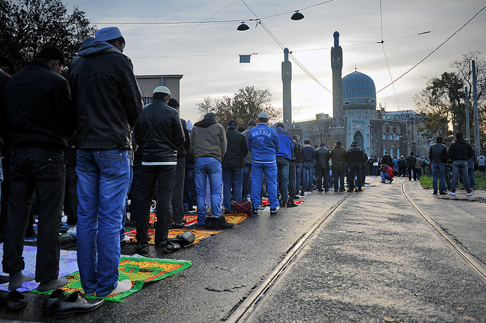 Мусульмане празднуют Курбан-байрам у мечети на «Горьковской»