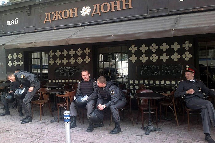 Одно из главных фото в русскоязычном твиттере 7 мая: сотрудники полиции на террасе зачищенного от оппозиционеров и случайных посетителей паба «Джон Донн»