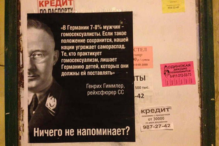 Активисты ЛГБТ-движения повесили в Петербурге плакаты с цитатой рейхсфюрера СС Генриха Гиммлера. «„В Германии 7-8% мужчин — гомосексуалисты. Если такое положение сохранится, нашей нации угрожает самораспад. Те, кто практикует гомосексуализм, лишает Германию детей, которых они должны ей поставлять“. Генрих Гиммлер. Ничего не напоминает?» — написано на черных плакатах, развешанных, в частности, на Каменноостровском проспекте и Новочеркасской.