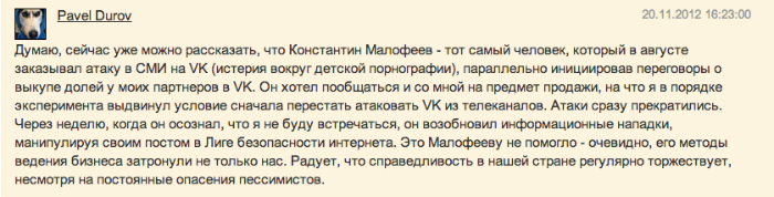 Павел Дуров обвинил бизнесмена Константина Малофеева, одного из разработчиков закона о «чёрном списке» сайтов, в заказе информационной атаки на социальную сеть «ВКонтакте». Летом сайт предлагали закрыть за якобы размещённую на нём детскую порнографию. По информации ряда СМИ, сегодня Малофеев, акционер «Ростелекома», был задержан по делу о хищении 200 миллионов долларов.