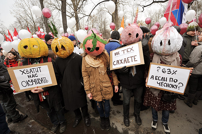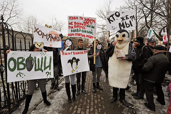 В начале шествия фотографам позировали оппозиционные «овощи» в масках из папье-маше, держа в руках плакатики с надписями: «Не тех сажаете». В то же время полиция задержала провокаторов — молодых людей, наряженных в хомячков и пингвина, которые отказывались покинуть колонну по просьбам организаторов шествия. «Куда ты завел нас, не видно ни зги, ты, верно, Навальный, нам пудришь мозги», — гласил плакат ряженых. Пингвин клевал попкорн. По одной из версий, это могли быть представители прокремлевских молодежных движений.