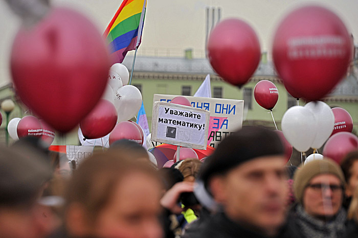 Пингвин-провокатор, оппозиционные овощи, алые и белые шарики петербургских наблюдателей и печальные политические плакаты — в фоторепортаже «Бумаги».
