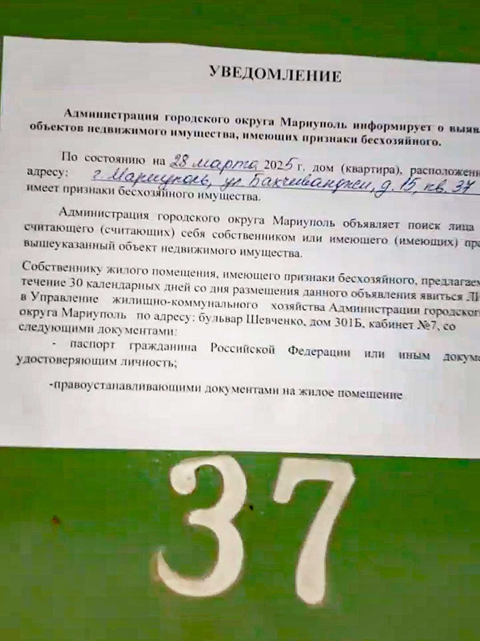 Владельцам жилья, получившим уведомление о «наличии у квартиры признаков бесхозной», дают месяц, чтобы прийти в администрацию и показать российские документы на жилье. Если не успеть это сделать, придется доказывать свое право собственности через суд. Глава российской городской администрации Олег Моргун в 2024 году упоминал, что за право на жилье с администрацией судятся 1300 семей.