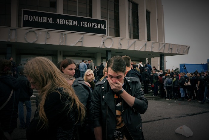Фото дня: петербуржцы прощаются с Михаилом Горшеневым, одним из лидеров группы «Король и Шут», умершим в ночь с 18 на 19 июля. Очередь из нескольких тысяч человек выстроилась у ДС «Юбилейный» с самого утра. Гроб с телом музыканта вынесли под пятиминутную овацию; когда черный катафалк в окружении группы байкеров отправился в крематорий — прах Горшка развеют по ветру — фанаты исполнили песню «Прыгну со скалы».