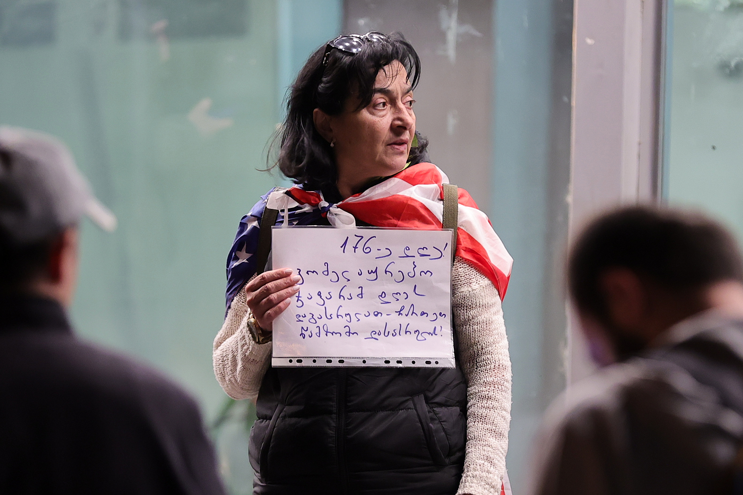 У здания Общественного вещателя Грузии вечером 22 мая немноголюдно. Около 30 человек курят, разговаривают и слушают профессора университета Илии Ию Эрадзе. Она сидит с микрофоном на ступеньках, говорит о социально-экономической ситуации в стране и ругает власти: «Мы видим, что вся система — инструмент репрессий и контроля общества. Мы должны понимать, что вся эта система строится на нашем труде».