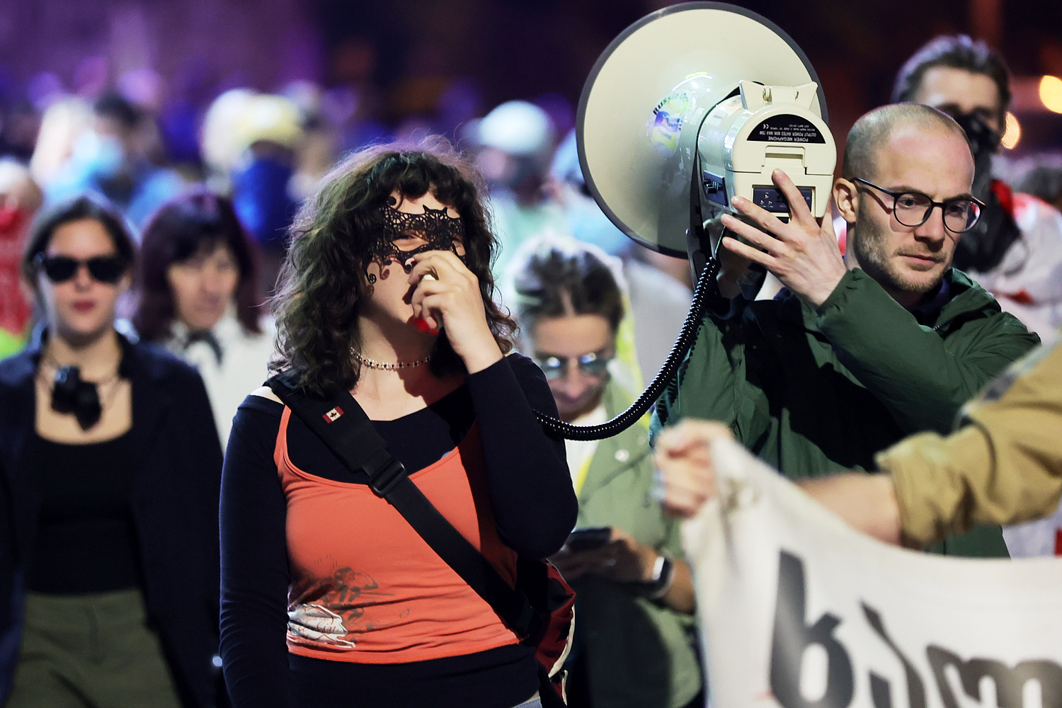 У здания звучат аплодисменты. Громкоговоритель берет девушка. Это Тако Хеладзе, которая уже много месяцев возглавляет марши от Общественного вещателя до парламента, воодушевляя протестующих скандировать.
