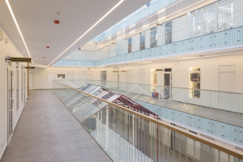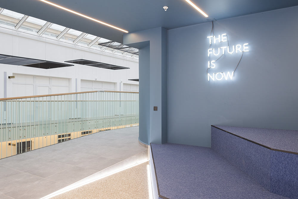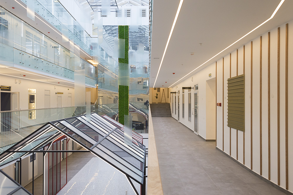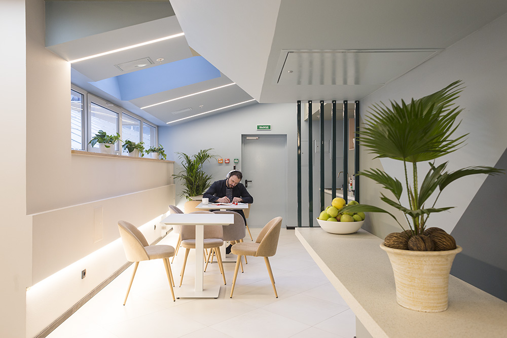 На пятом и частично четвертом этажах находится коворкинг площадью 1200 квадратных метров. Там организовано 250 рабочих мест в формате опенспейса. Есть также отдельные кабинеты, рекреационные зоны и переговорные комнаты.