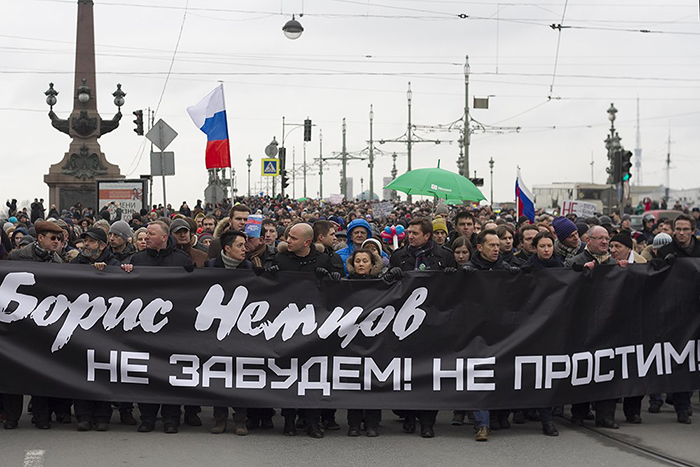Многотысячную колонну возглавили организаторы митинга, которые несли широкий черный баннер с именем Немцова. Время от времени они останавливались, скандируя «Не забудем, не простим», однако речевки мало кто подхватывал: после пары повторений толпа стихала и молча продолжала движение в сторону Марсова поля. Полиция только следила за тем, чтобы участники марша не выбегали на встречную полосу, движение по которой не было перекрыто.