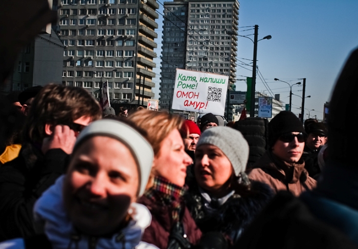 Периодически там кто-нибудь появлялся. Несколько раз туда-сюда продефилировала пожилая пара, державшая плакат «Нас оПУТали». Националисты, решившие, что им не по пути с основным протестным движением, покинули митинг, коллективно неся огромный имперский флаг.