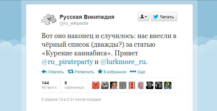 Сообщение в официальном твиттере русскоязычной Википедии