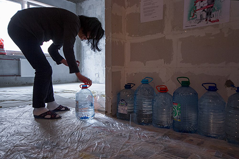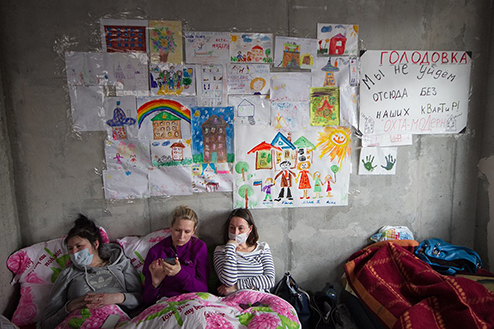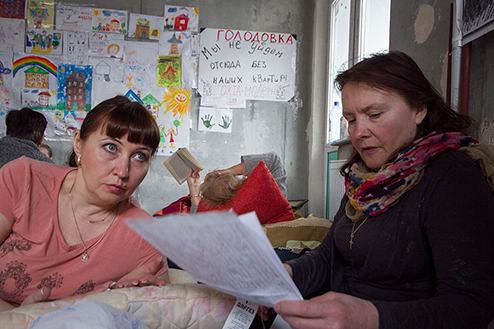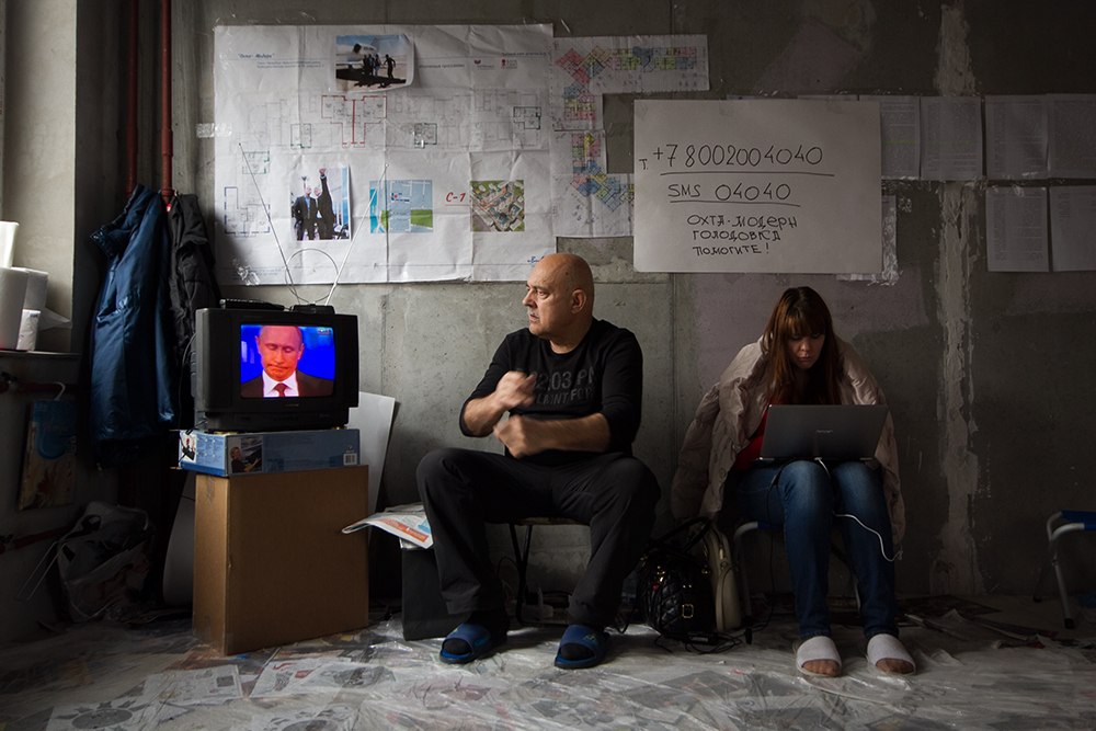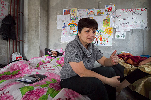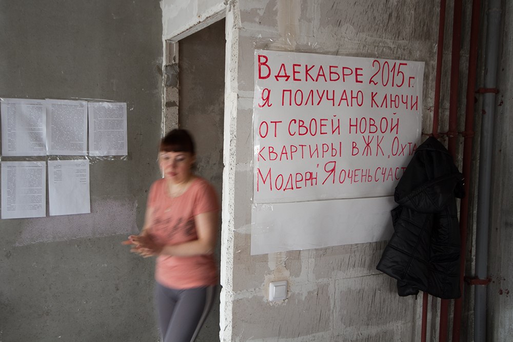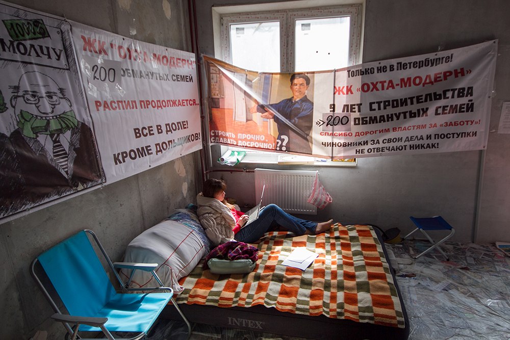 Голые бетонные стены, мешки строительного мусора, штукатурка на полу и пыль в воздухе. Дольщики «Охта-модерна» голодают фактически на стройке, в одном из все-таки возведенных домов комплекса, сданном недавно и пока абсолютно непригодном для жилья. Пол квартиры, где сидят голодающие, застелили газетами и пленкой, рядом со входом для посетителей предусмотрительно висит мешок с бахилами, чтобы хотя бы как-то оградить себя от грязи незаселенного дома. Весь день голодающие внимательно следили за прямой линией Владимира Путина. Они отправляли многочисленные SMS-ки, звонили и даже записывали видеообращение к президенту. Каждый раз, когда ведущая объявляет видеовопрос, кто-то кричит: «Тихо! Тихо!», и все мгновенно разворачиваются к экрану. — Пять дней отлежались дома: все болели, просто в лежку! Даже сил не было идти к врачам никаким, — дольщица Людмила Максимова участвует уже во второй голодовке. Первая, приостановленная на прошлой неделе, продлилась 17 дней. По ее словам, у нее «просто нет другого выхода»: для того чтобы купить жилплощадь в «Охта-модерне», Максимовой пришлось продать две квартиры и дачу. На Большеохтинском, 15 у нее должна была быть просторная квартира, в которую она вложила семь миллионов и куда планировала переехать со всей семьей. Через несколько лет Максимова выходит на пенсию, поэтому заработать на новую квартиру уже не рассчитывает. Постоянно здесь голодают несколько дольщиков — это либо пенсионеры, либо те, кто, как и Максимова, взял отпуск, чтобы поучаствовать в голодовке. Остальные же, кто не может отпроситься с работы, приходят поддерживать голодающих по вечерам.
