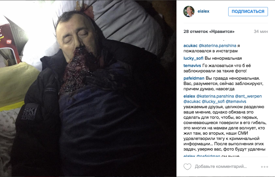 В МВД России сегодня сообщил о предполагаемом самоубийстве подозреваемого в совершении четырех убийств Амирана Георгадзе. Официальный представитель ведомства Елена Алексеева выложила в своем личном Instagram фотографии трупа, где они соседствуют со снимками платьев и детей.