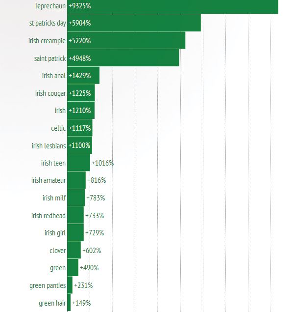 Число запросов со словом «Irish» («ирландский») выросло в этот день на 1210 %. В 2,5 раза чаще, чем обычно пользователи искали порноролики, в названии которых значилось слово «luck» («удача»). Больше всего посетителей Pornhub заинтересовал запрос «leprechaun» («лепрекон») — экзотическое порно 17 марта искали на 9325 % чаще, чем обычно.