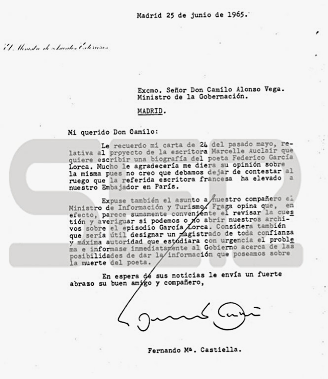 В 1964 году писательница и исследовательница испанской поэзии Марсель Оклер, знавшая Гарсиа Лорку лично, отправила в испанское посольство в Париже официальный запрос, где просила прояснить обстоятельства гибели писателя. Однако власти засомневались в необходимости поднимать «дело Лорки», ответив, что у них «нет возможности дать официальную версию того, как произошло это событие». Отчет был составлен, но не был передан писательнице.