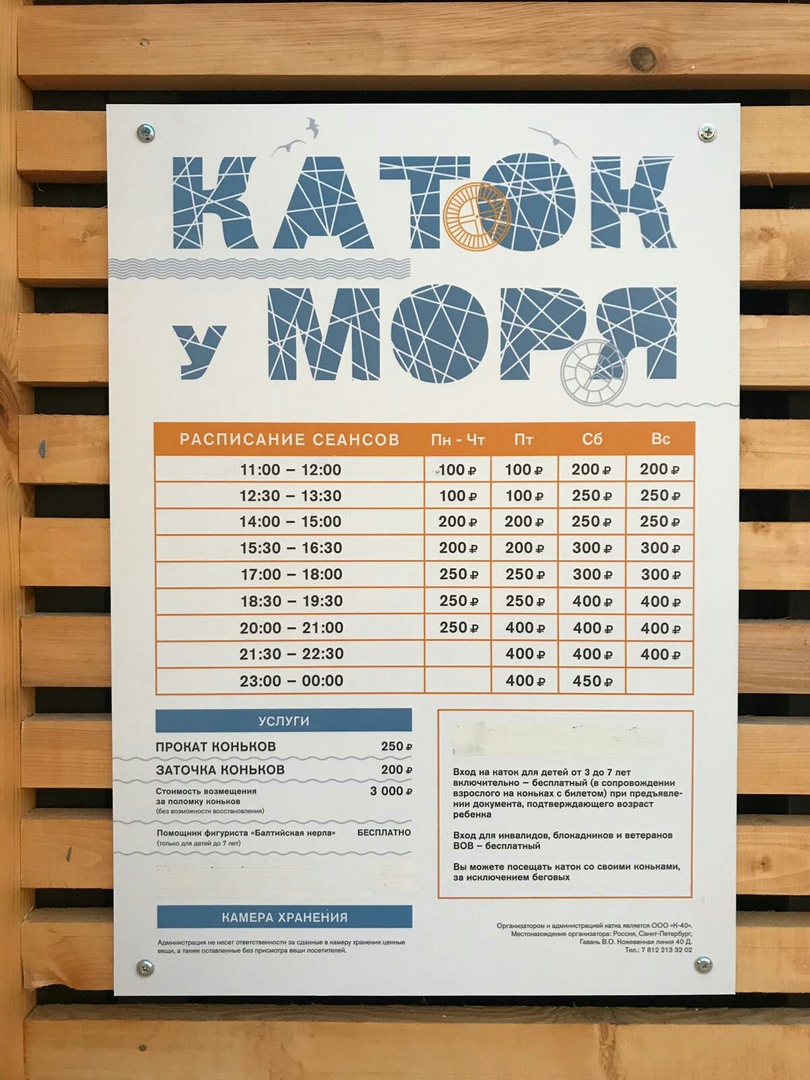 Официальное открытие катка состоится 22 декабря. В пресс-службе «Севкабель Порта» «Бумаге» также предоставили расписание катка после открытия и цены. Вход на лед в зависимости от дня недели и времени суток будет стоить от 100 до 450 рублей. Прокат коньков обойдется в 250 рублей.