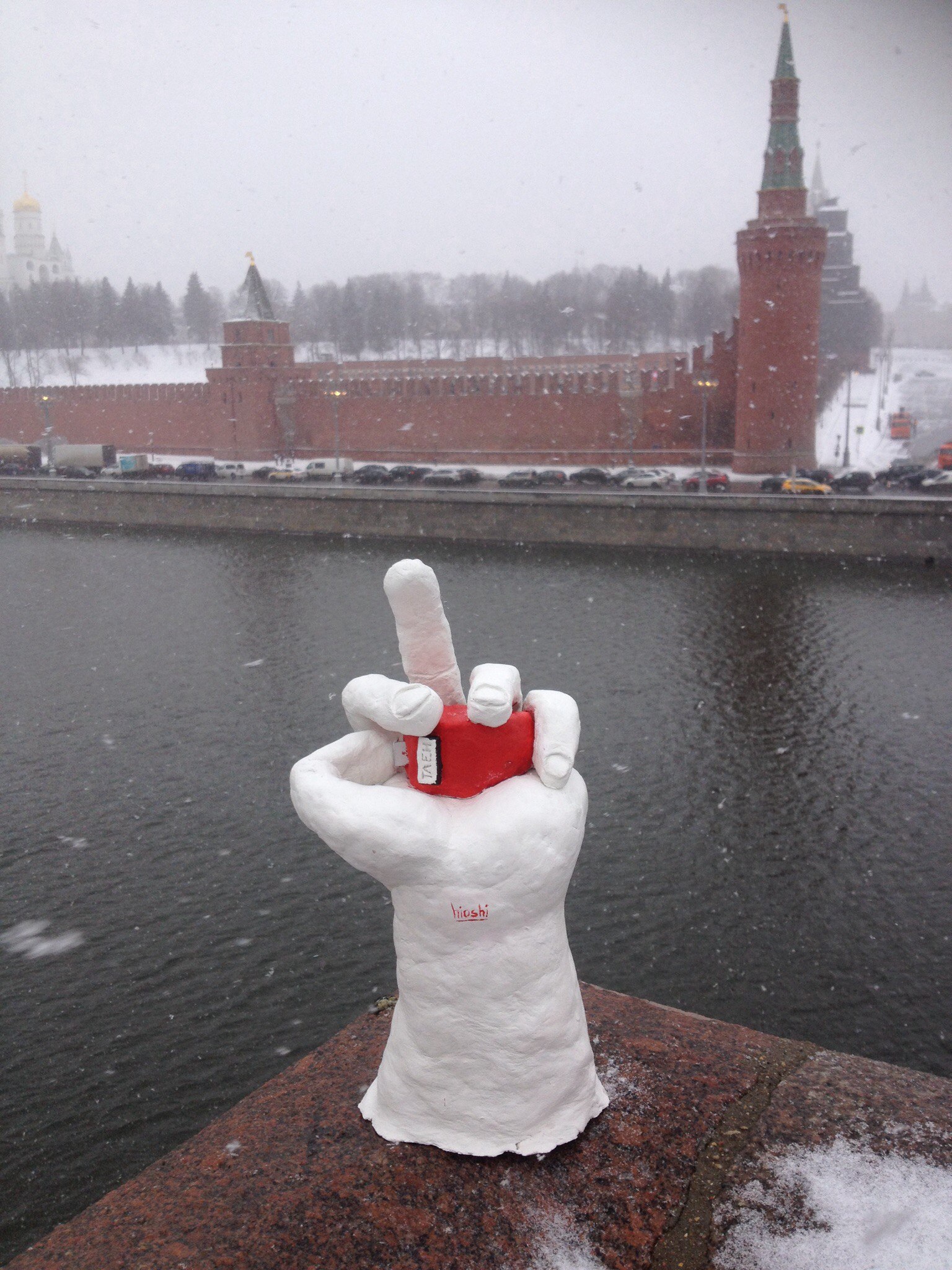 Уличный художник Hioshi установил у Кремля мини-скульптуру руки с вытянутым средним пальцем