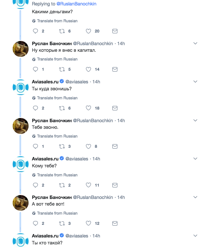 Петербуржец Руслан Баночкин и представители компании Aviasales воспроизвели в твиттере популярный пранк нулевых «Че с деньгами?». Баночкин в твиттере написал аккаунту компании «Ну как там с деньгами?».