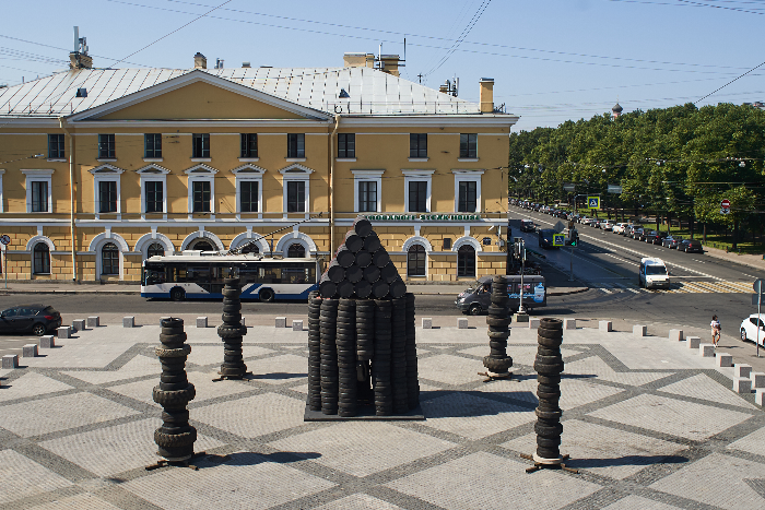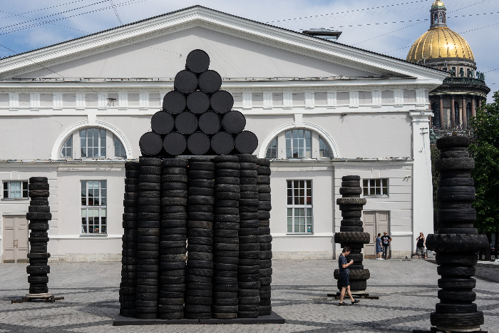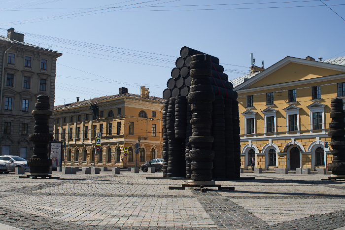 У «Манежа» в Петербурге появилась арт-инсталляция Recycle chapel — капелла, сделанная из автомобильных покрышек.