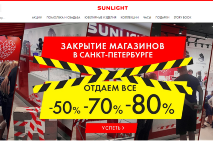 Сеть ювелирных магазинов Sunlight объявила, что закрывает почти все свои точки в России, в том числе более 20 в Петербурге и более 60 в Москве. Также компания объявила распродажу своей продукции со скидками до 80 %. Об этом говорится на сайте Sunlight.
