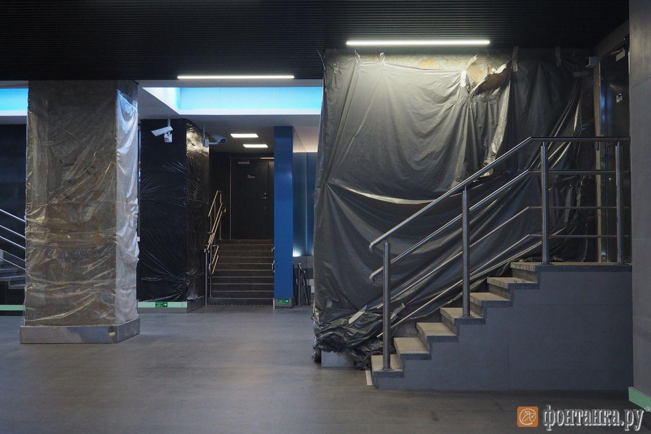 В вестибюле метро «Новокрестовская» в нескольких местах сняли облицовочную плитку и закрыли стены полиэтиленом. Об этом сообщает «Фонтанка».