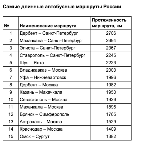 Сервис путешествий OneTwoTrip посчитал, какие автобусные маршруты по России самые длинные. Первое место рейтинга занял рейс из Дербента в Петербург — длина маршрута составляет 2706 км.