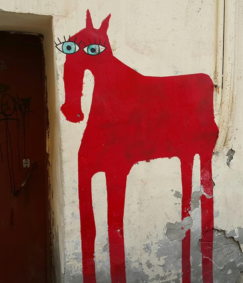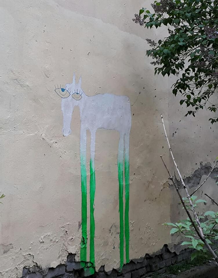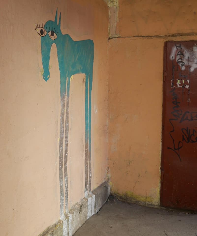 Жители Васильевского острова рассказали в соцсетях, что регулярно видят на стенах зданий рисунки разноцветных лошадей с длинными ногами.