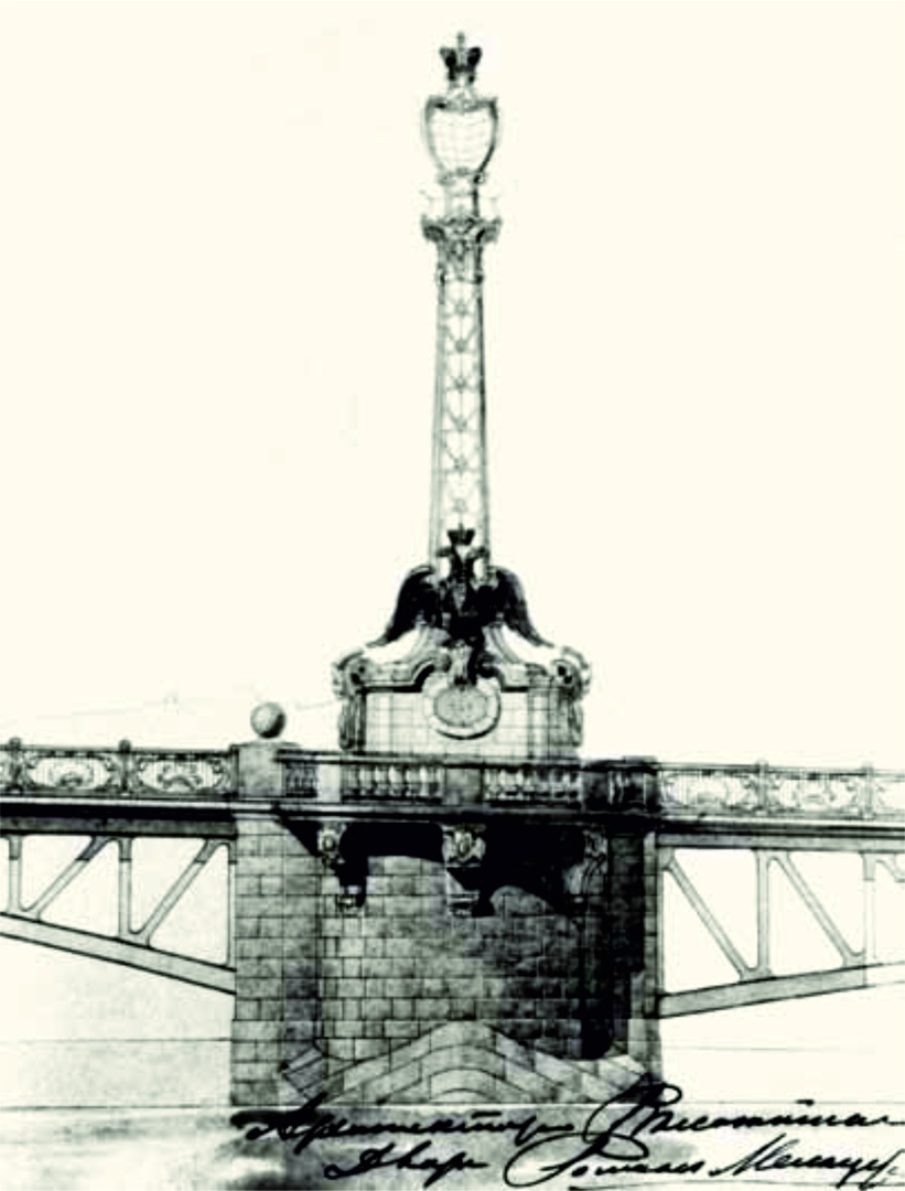 Как рассказали в организации, по задумке Мельцера отделка моста планировалась очень пышной. Там хотели установить четыре фонаря высотой около 20 метров, украшенные золочеными статуями орлов, коронами и орнаментами. Однако из-за Первой мировой войны реализовать проект не получилось, перила и фонари установили только в советские годы.
