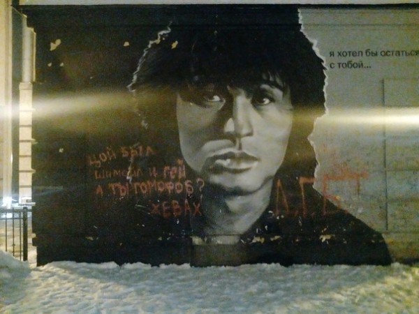 На граффити написано, что Цой был геем, а также задается вопрос «А ты гомофоб?». Надпись подписана «хЕВАх». Такая же подпись была под испорченными граффити со Станиславом Черчесовым и Данилой Багровым. Те граффити испортил Анатолий Обросков, который называет себя скинхедом-трансгендером. Обросков также пытался выдвинуться на должность президента РФ от «Партии ультраправых трансгендеров и натуралов» и хотел устроить референдум за сухой закон.