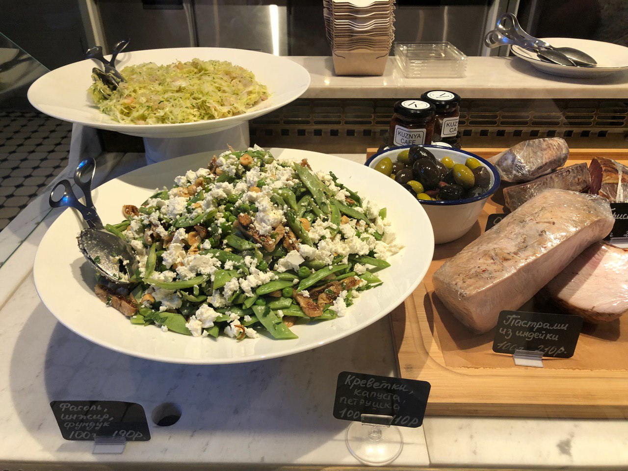 По будням до 12:00 и по выходным до 14:00 в Kuznya Cafe подают завтраки. Например, в меню есть каши, тосты, сырники и омлет. На стойке с блюдами to go продают выпечку, салаты и фрукты в порционных упаковках.