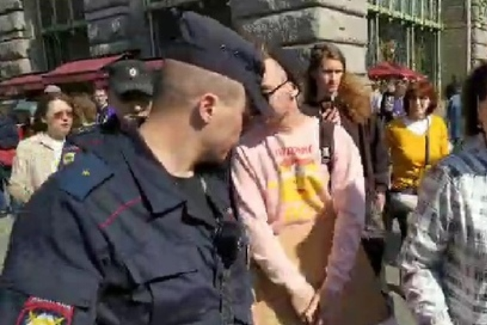 На Невском проспекте во время одиночного пикета сотрудники полиции задержали петербургского художника Алексея Соловьева, который пришел на акцию в толстовке с надписью «Пудинг лор».