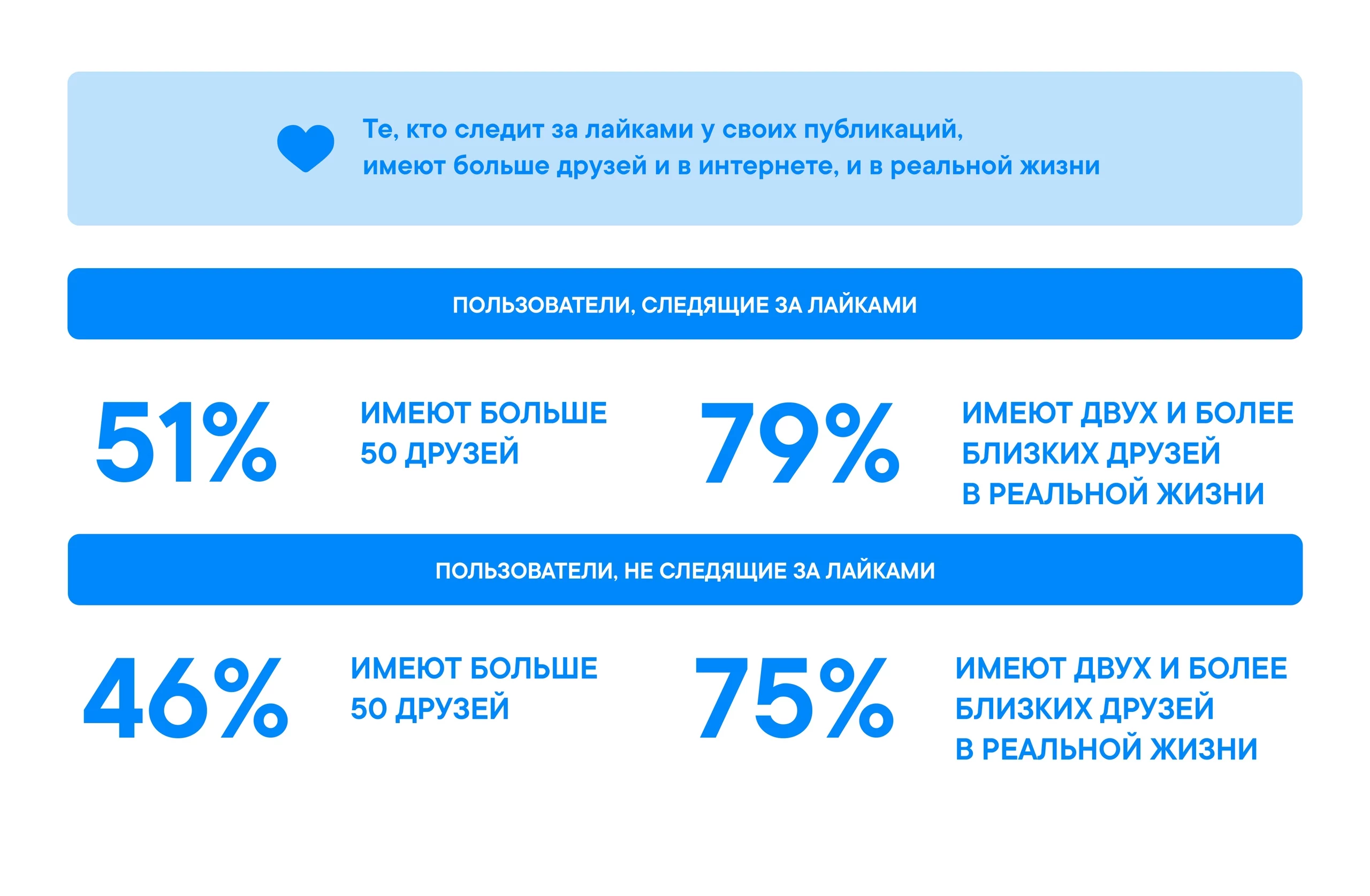 Молодые люди, которые следят за лайками, чаще сидят во «ВКонтакте», Instagram, TikTok и реже в Facebook. Соцсети Twitter, «Одноклассники» и YouTube одинаково популярны у тех, кому важны лайки и кому нет. При этом те, кто пользуется Instagram, гораздо чаще следят за лайками, чем те, кто не пользуются этой соцсетью. К тому же те, кто следит за лайками, чаще говорят, что не могут остаться без связи. Примерно 54 % зумеров готовы удалить непопулярную публикацию.