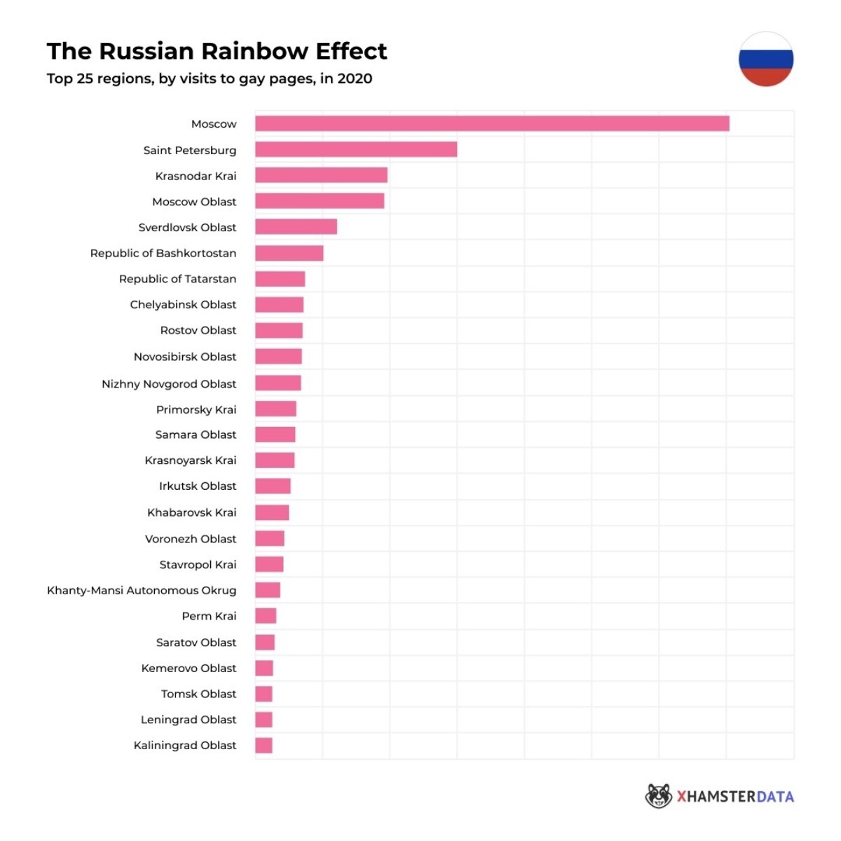 Представители сервиса отмечают, что в некоторых регионах в сравнении с 2019 годом значительно вырос интерес к ЛГБТ-роликам. Например, рост интереса к разделу «Геи» на порносайте зафиксировали в Чукотке (больше 80 %), Еврейской автономной области (почти 40 %) и Бурятии (более 20 %).