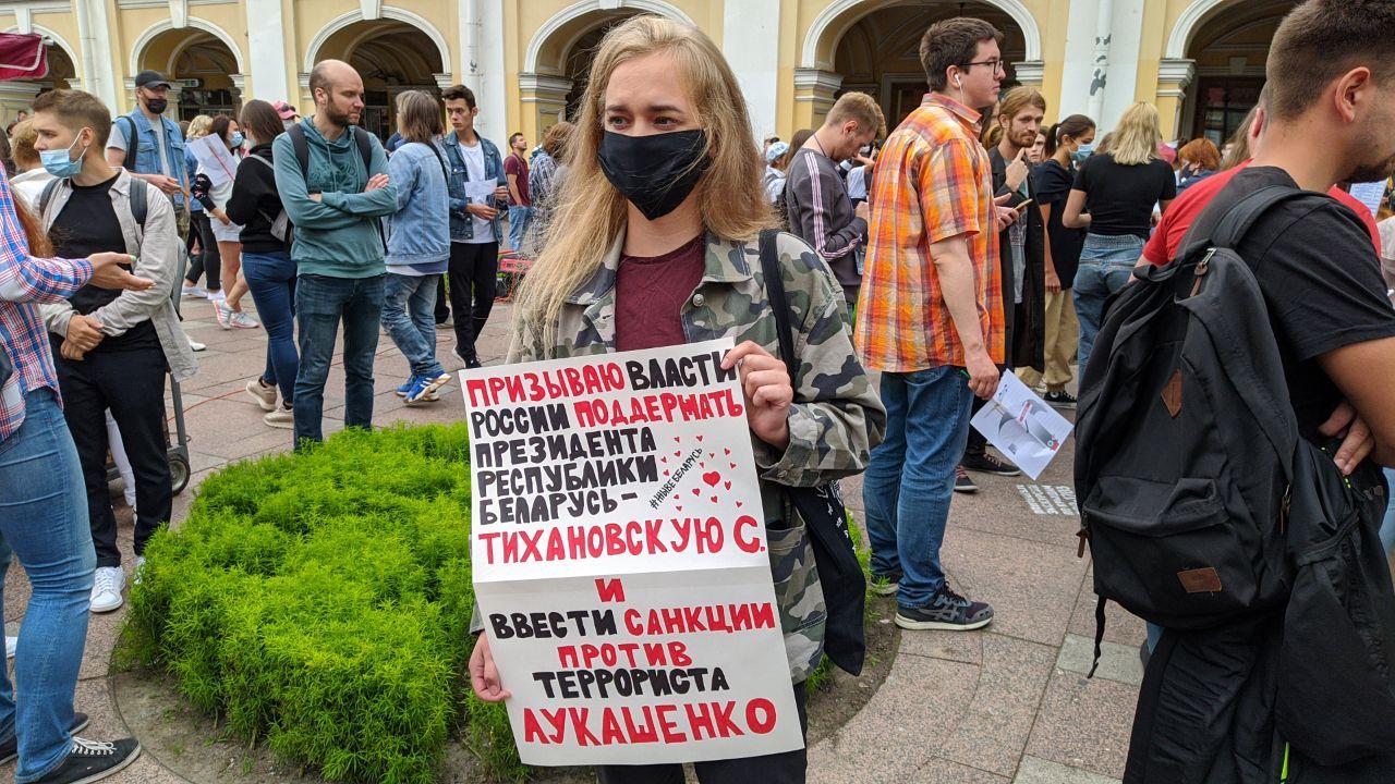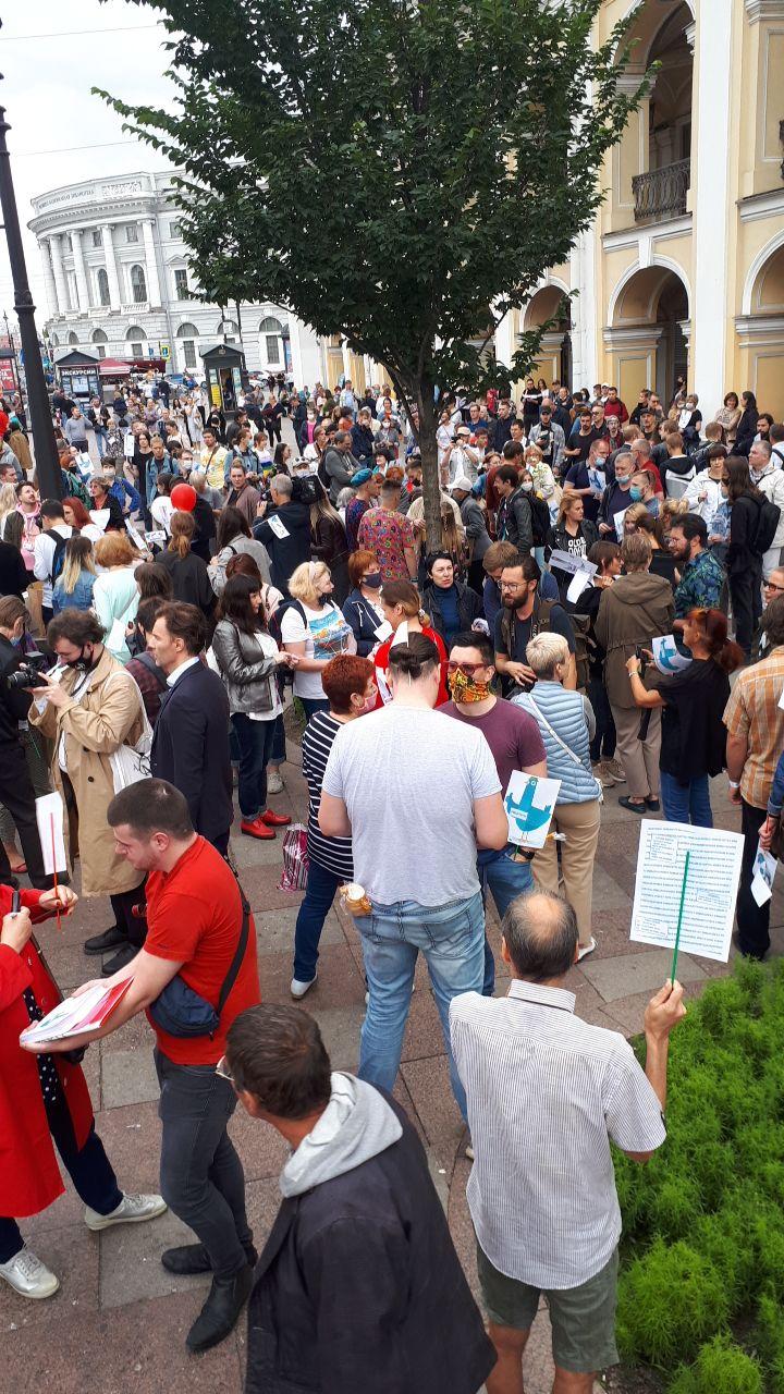 Днем 15 августа у Гостиного двора в Петербурге началась третья акция от Либертарианской партии России — на этот раз она заявлена в поддержку Беларуси, Хабаровска и Куштау. На площадь вышло более 300 человек, сообщает корреспондент «Бумаги» с места событий.