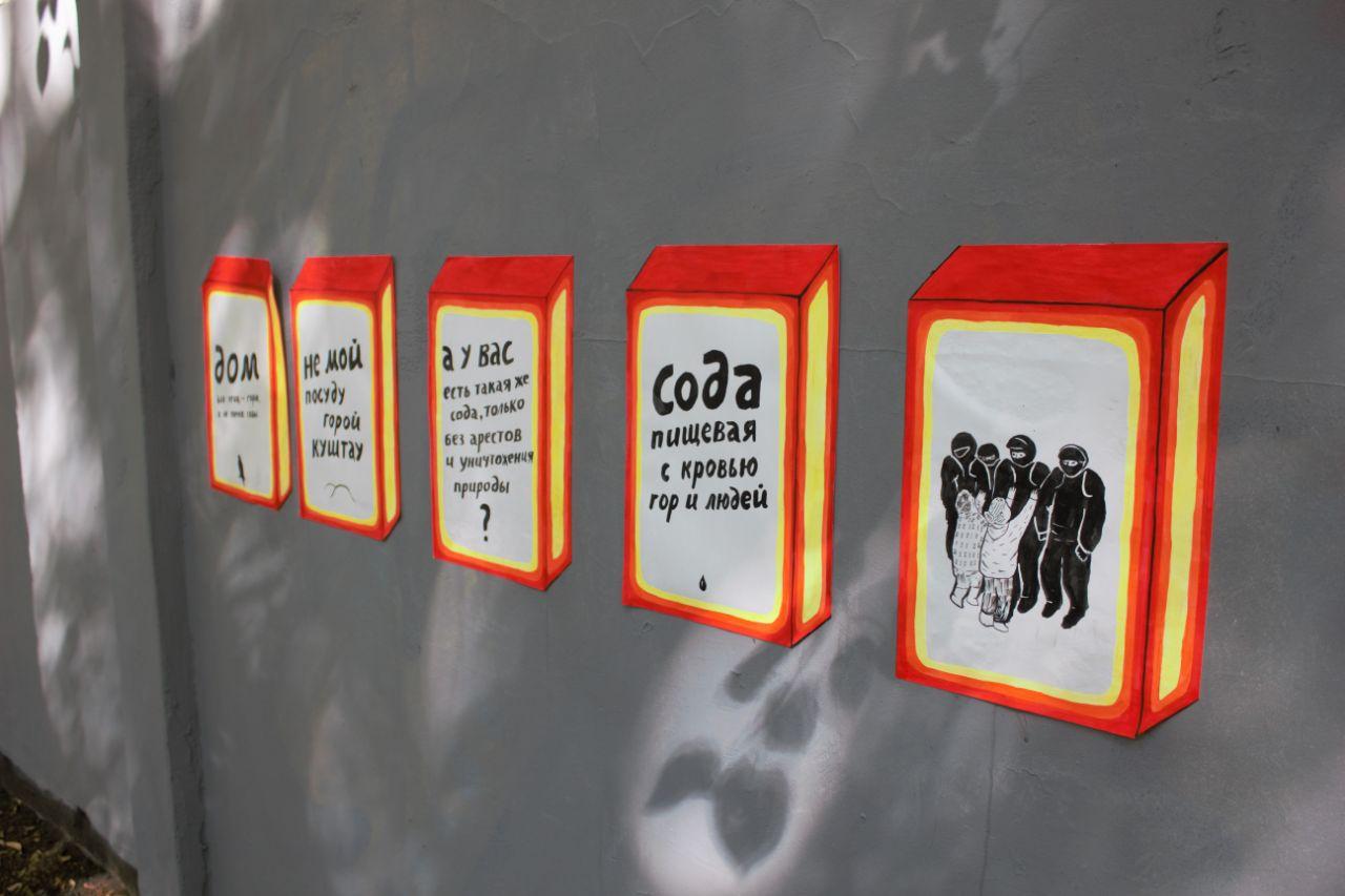 На стене одного из домов города активисты нарисовали упаковки пищевой соды. На них они написали «Дом для птиц — гора, а не пачка соды», «Сода пищевая с кровью гор и людей» и «Не мой посуду горой Куштау».