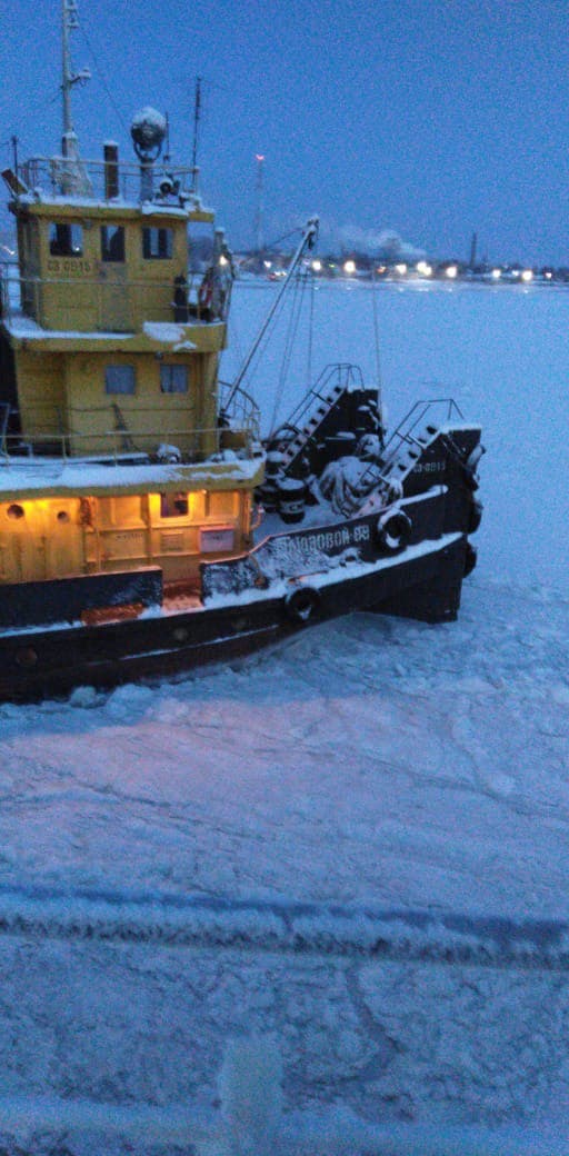 Буксир «Шлюзовой-99» вышел к парому с Вознесенской ремонтно-эксплуатационной базы, сломал вокруг него лед и, взяв на буксир, довел до берега.