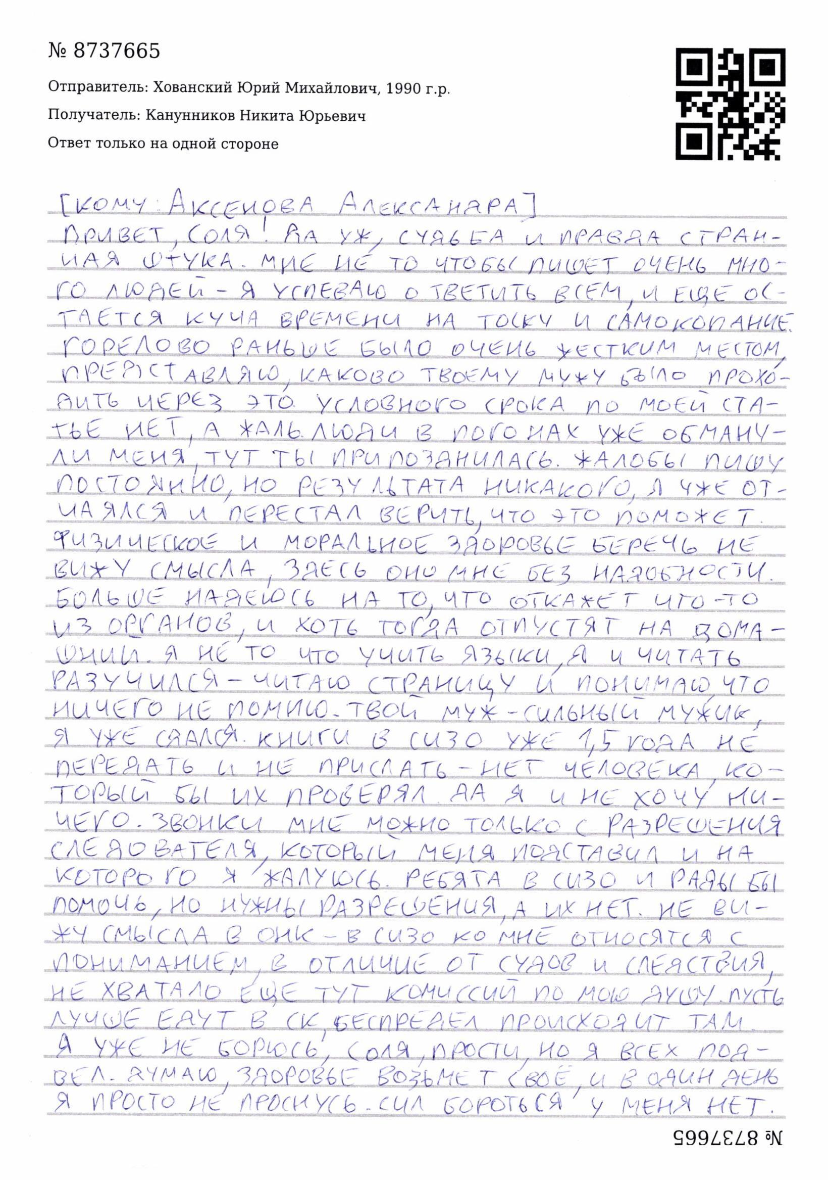 По словам Хованского, сотрудники СИЗО относятся к нему с пониманием — в отличие от следователей и судей. Однако он не видит смысла беречь физическое и ментальное здоровье и надеется, что у него откажет один из органов, чтобы его всё-таки перевели под домашний арест.