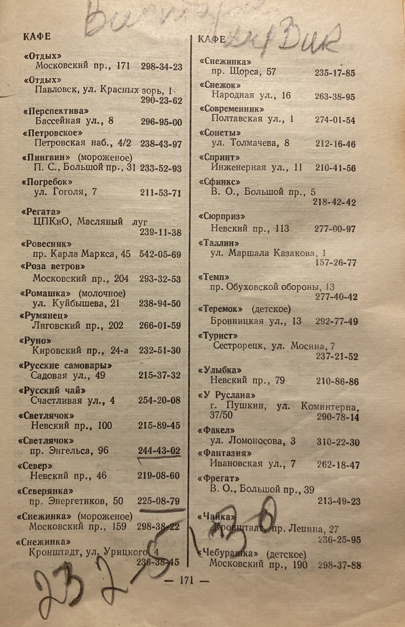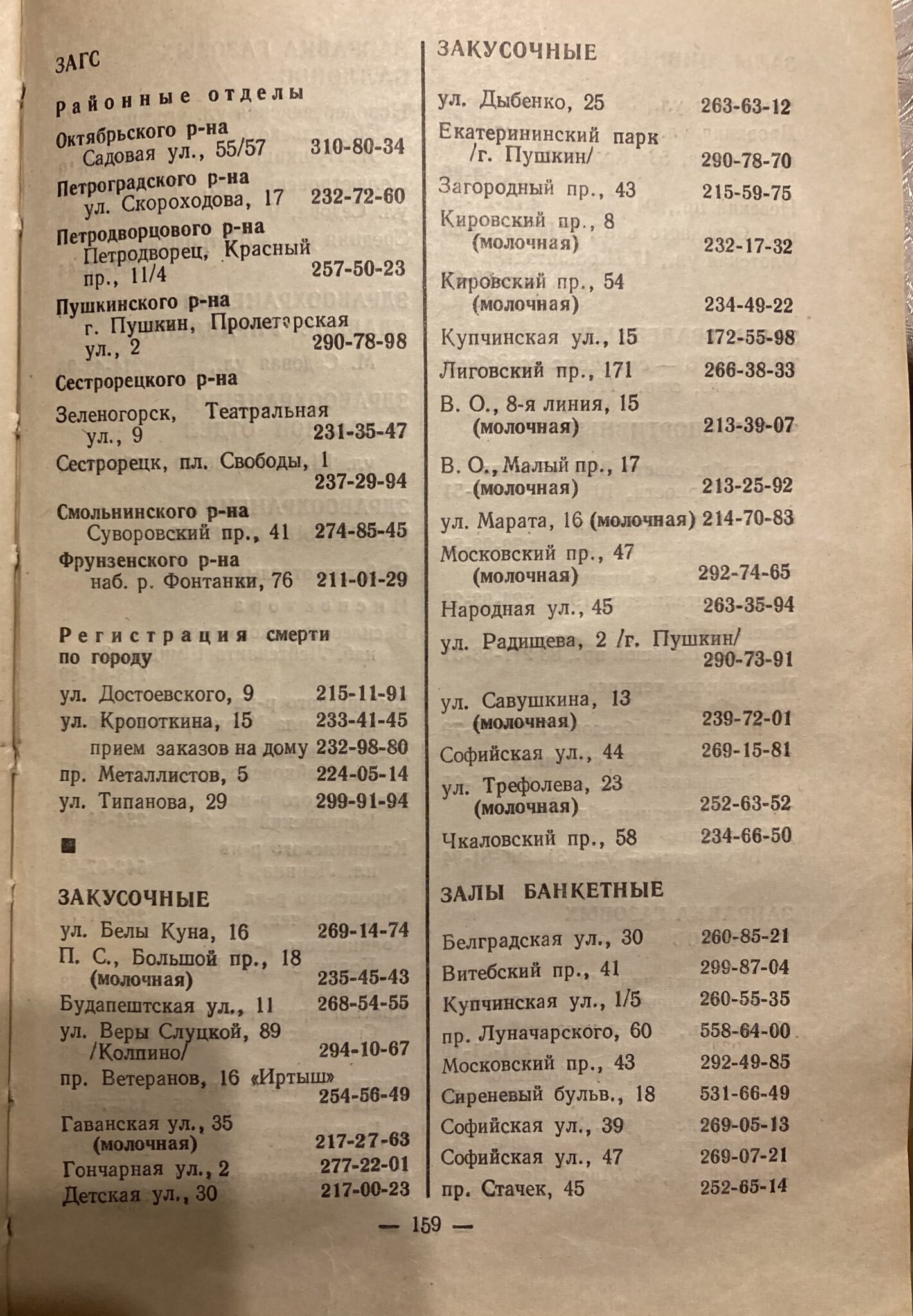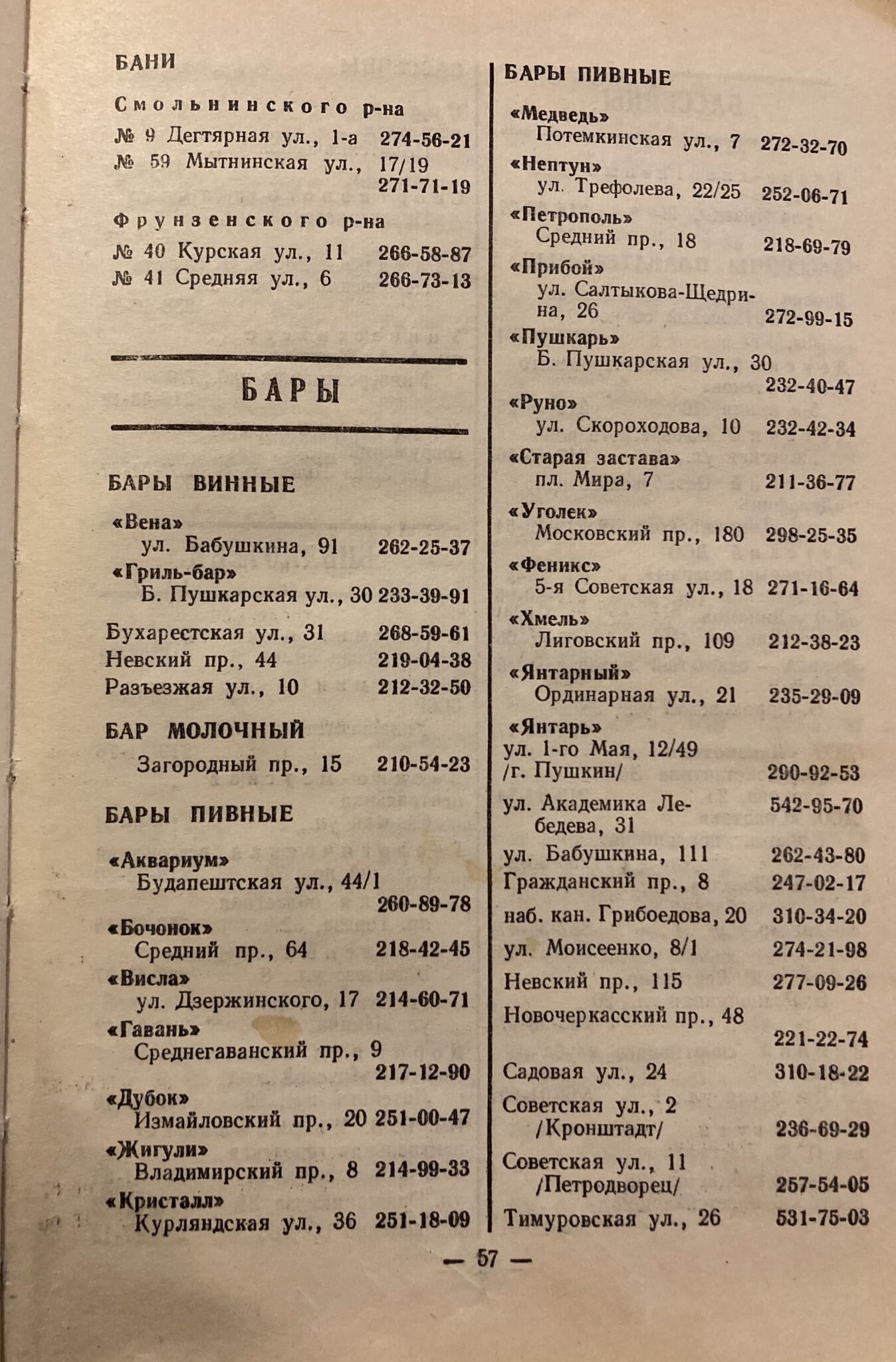 Журналист Андрей Захаров купил на Удельном рынке телефонный справочник за 1980 год с контактами заведений общепита Ленинграда. В нем упоминаются винные, пивные, молочные бары, котлетные и бульонные. «Бумага» показывает несколько страниц путеводителя.