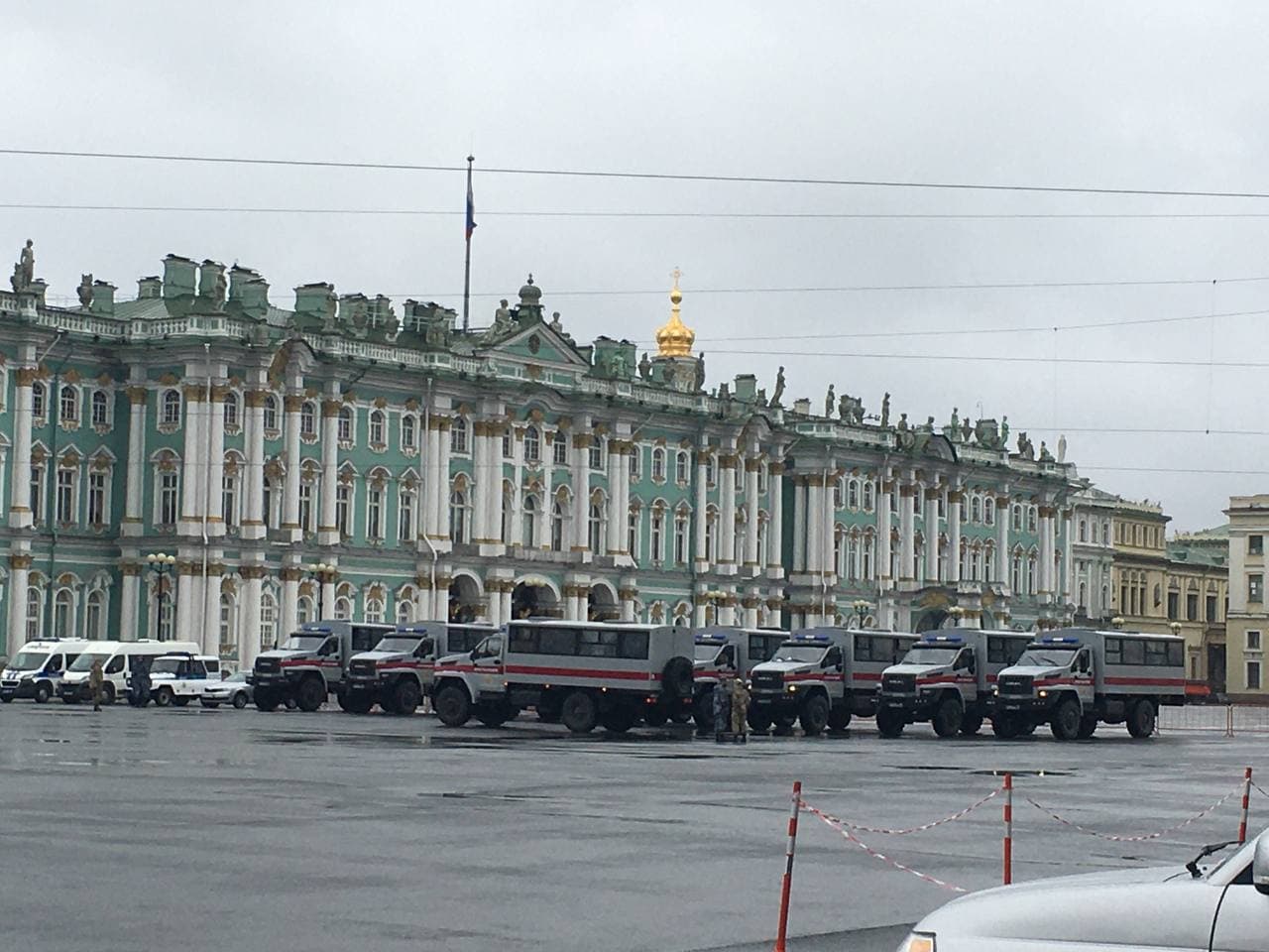 У Дворцовой и вдоль Невского проспекта выставили ограждения. На площади дежурят силовики и стоят автозаки.