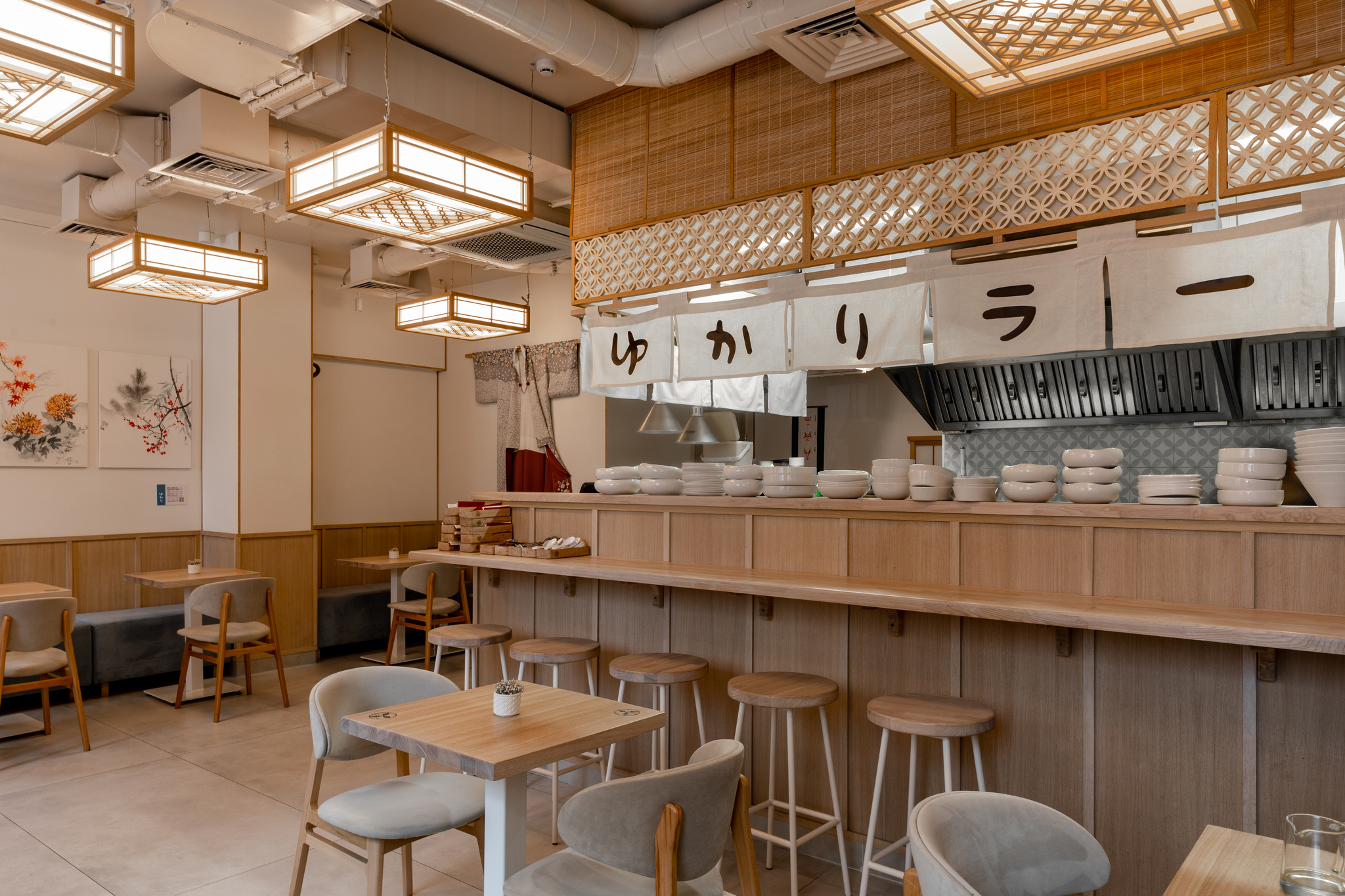 Интерьер выполнили в розово-серых тонах с использованием дерева, бетона и живых растений. На одной из стен можно найти неоновую лампу в виде гибискуса, рядом с ней находится коммунальный стол со столешницей из розового бетона.