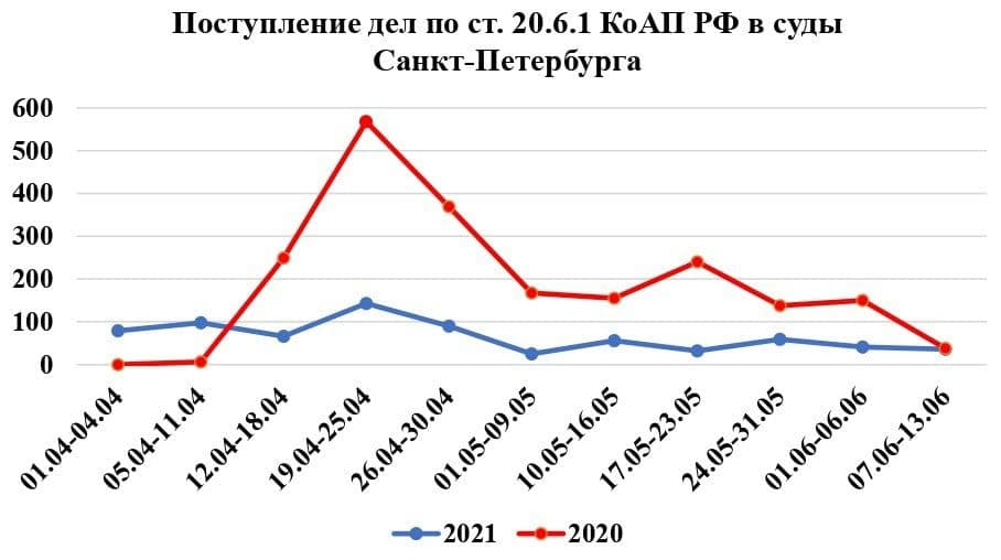 Согласно статистике, в 2021 году протоколов было заметно меньше. Так, с 1 по 13 июня 2021 года в суды Петербурга поступило 77 протоколов о нарушении городских запретов. А за аналогичный период 2020-го было 188 таких протоколов. В мае 2021 года было 172 протокола, а в мае 2020-го — 700. В апреле 2021-го — 476, а в апреле 2020-го — 1192.