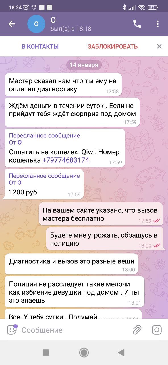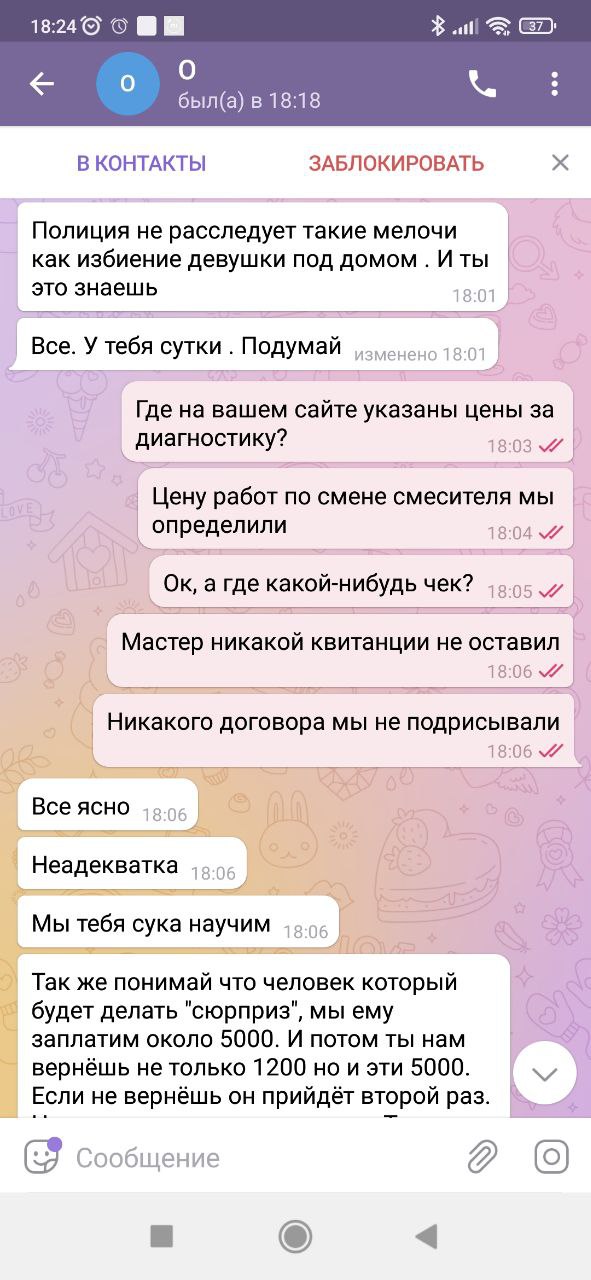 Пользовательница Бафометка Кибердвачиня рассказала, что обратилась в службу сайта santech-uslugi.ru за консультацией по поводу протекающего крана. После выполнения работ сантехник потребовал плату — на сайте при этом было указано, что вызов мастера бесплатный. Девушка обсудила с сантехником дальнейшие шаги, после чего он ушел. Однако вскоре она получила от службы угрозы физической расправы, оскорбления и требование заплатить 1200 рублей.