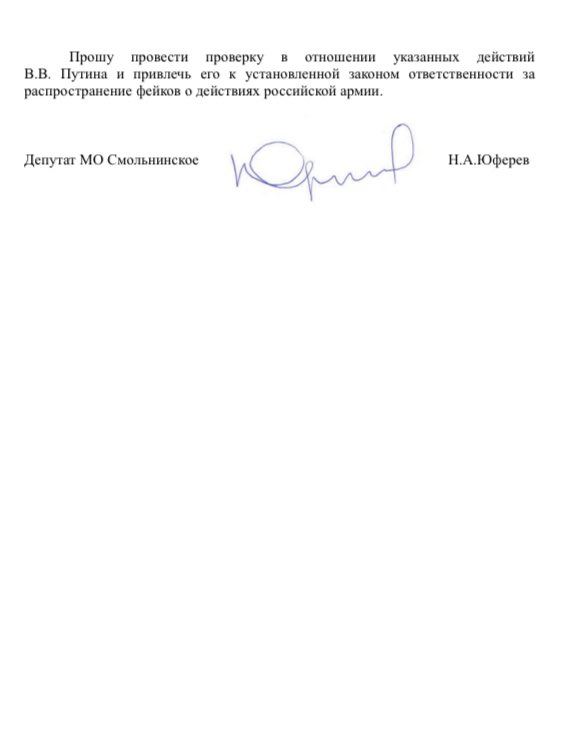 Юферев попросил глав силовых ведомств проверить заявление Путина по статье о «фейках» о российской армии (ст. 207.3 УК). «Но указа о завершении СВО не было, войну не объявляли. За такие слова про войну осудили уже несколько тысяч человек», — добавил муниципальный депутат.
